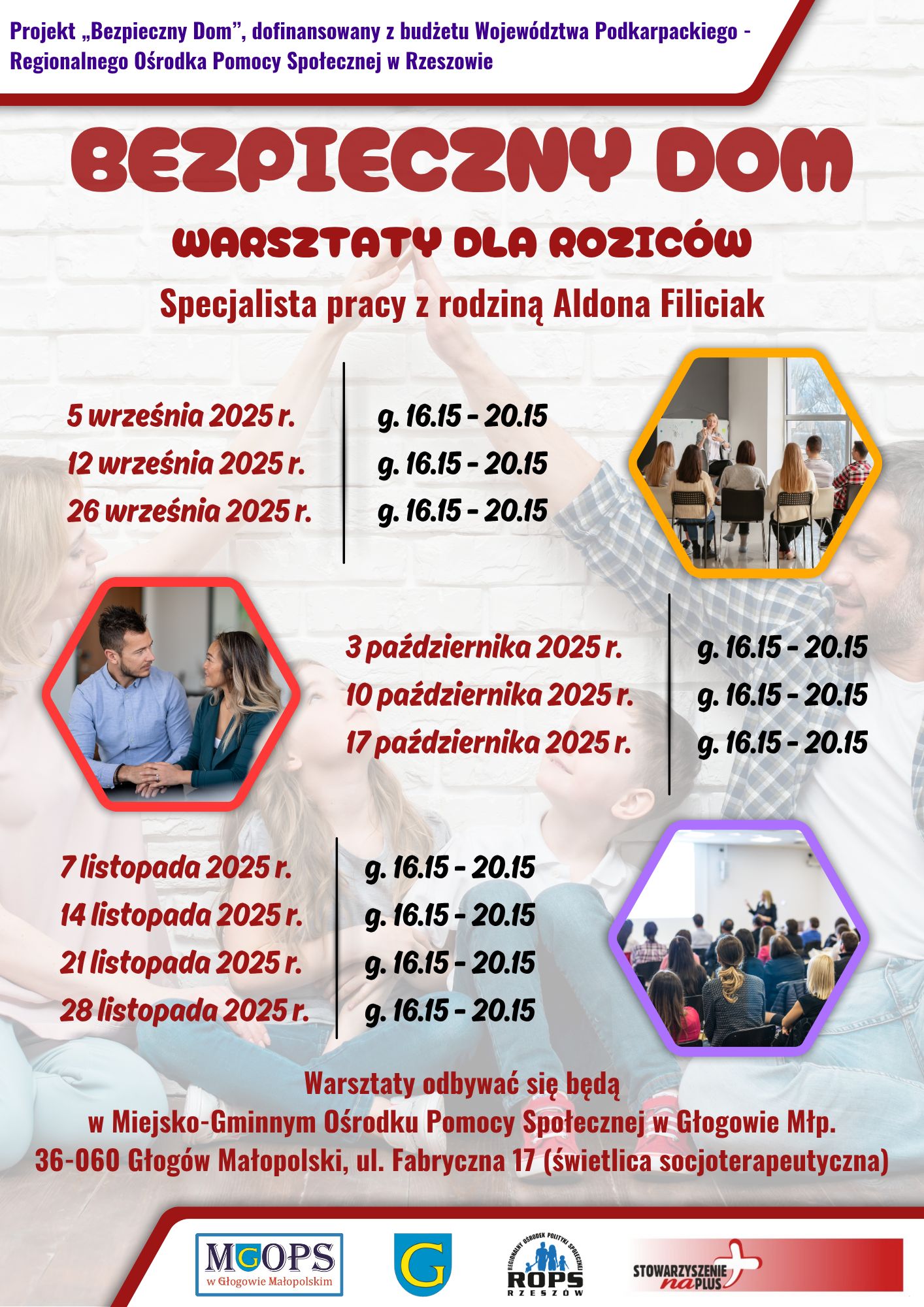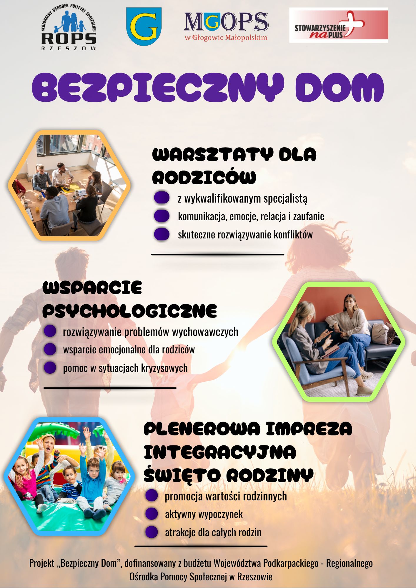 ✅ Miejsko - Gminny Ośrodek Pomocy Społecznej w Kolbuszowej w partnerstwie ze Stowarzyszeniem „Na Plus” zaprasza rodziny do zapisów do projektu "Bezpieczny Dom", który jest współfinansowany z budżetu Województwa Podkarpackiego - Regionalnego Ośrodka Pomocy Społecznej w Rzeszowie. W ramach projektu oferujemy m.in. bezpłatne porady psychologiczne, które pomogą Ci zadbać o równowagę emocjonalną, relacje rodzinne i odporność psychiczną w trudnych sytuacjach. Od września br. w Miejsko – Gminnym Ośrodku Pomocy Społecznej w Głogowie Małopolskim rozpoczną się również warsztaty dla rodziców. Spotkania poprowadzi doświadczony pedagog z długoletnim stażem w pracy z rodzinami, zarówno w obszarze wspierania w pełnieniu funkcji rodzicielskich jak i podnoszeniu kompetencji wychowawczych.