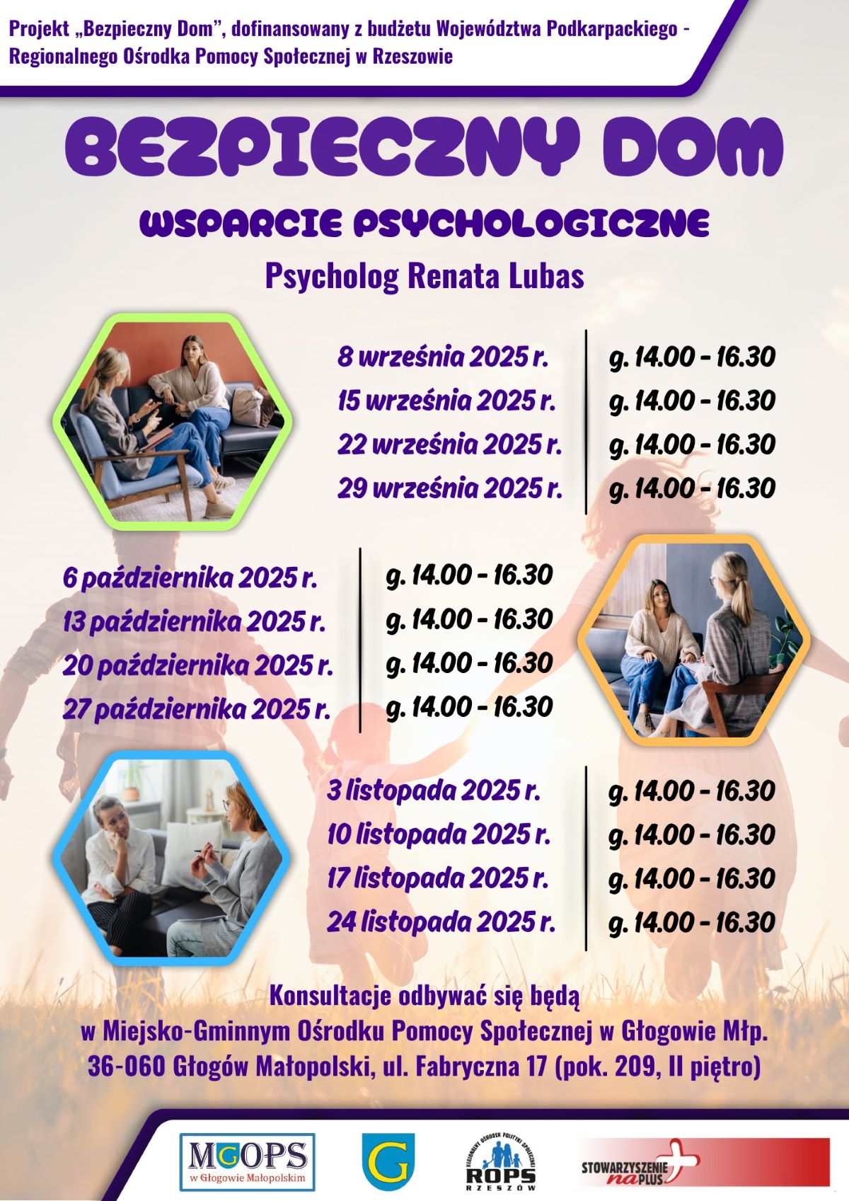 ✅ W projekcie m.in.: indywidualne konsultacje z psychologiem, wsparcie emocjonalne w radzeniu sobie ze stresem i konfliktami, praktyczne wskazówki dotyczące budowania bezpiecznego i spokojnego domu, pomoc w rozwiązywaniu problemów wychowawczych, pomoc w sytuacjach kryzysowych.